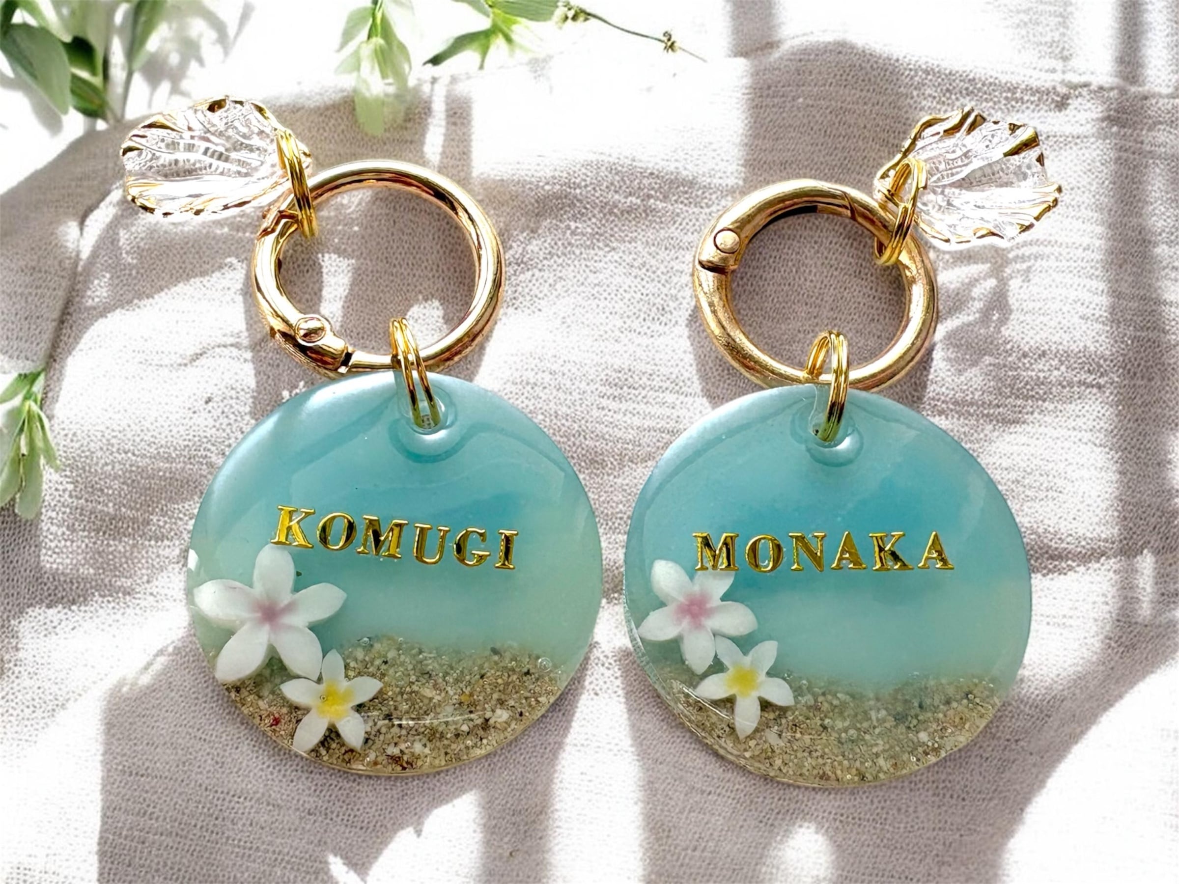 海とお花のネームタグ|くすみブルー|レジン迷子札|名入れオーダー|小型犬〜大型犬用